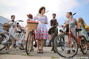 Participants dressed in early 20 century dress, ride the same era’s bicycle on July 19 in St. Petersburg, Russia http://english.cri.cn/12394/2014/07/21/3441s836975_3.htm